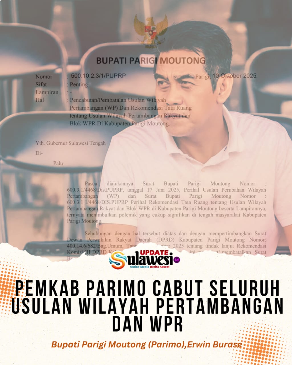 Dalam surat yang ditandatangani secara elektronik oleh Erwin Burase, dijelaskan bahwa keputusan ini diambil setelah melalui berbagai pertimbangan, termasuk merujuk pada dua surat terdahulu, yakni Surat Nomor 600.3.1.1/4468/Dis.PUPRP tertanggal 17 Juni 2025 tentang Usulan Perubahan Wilayah Pertambangan, serta Surat Nomor 600.3.1.1/4468/Dis.PUPRP tentang Rekomendasi Tata Ruang WPR dan Blok WPR di Kabupaten Parimo.