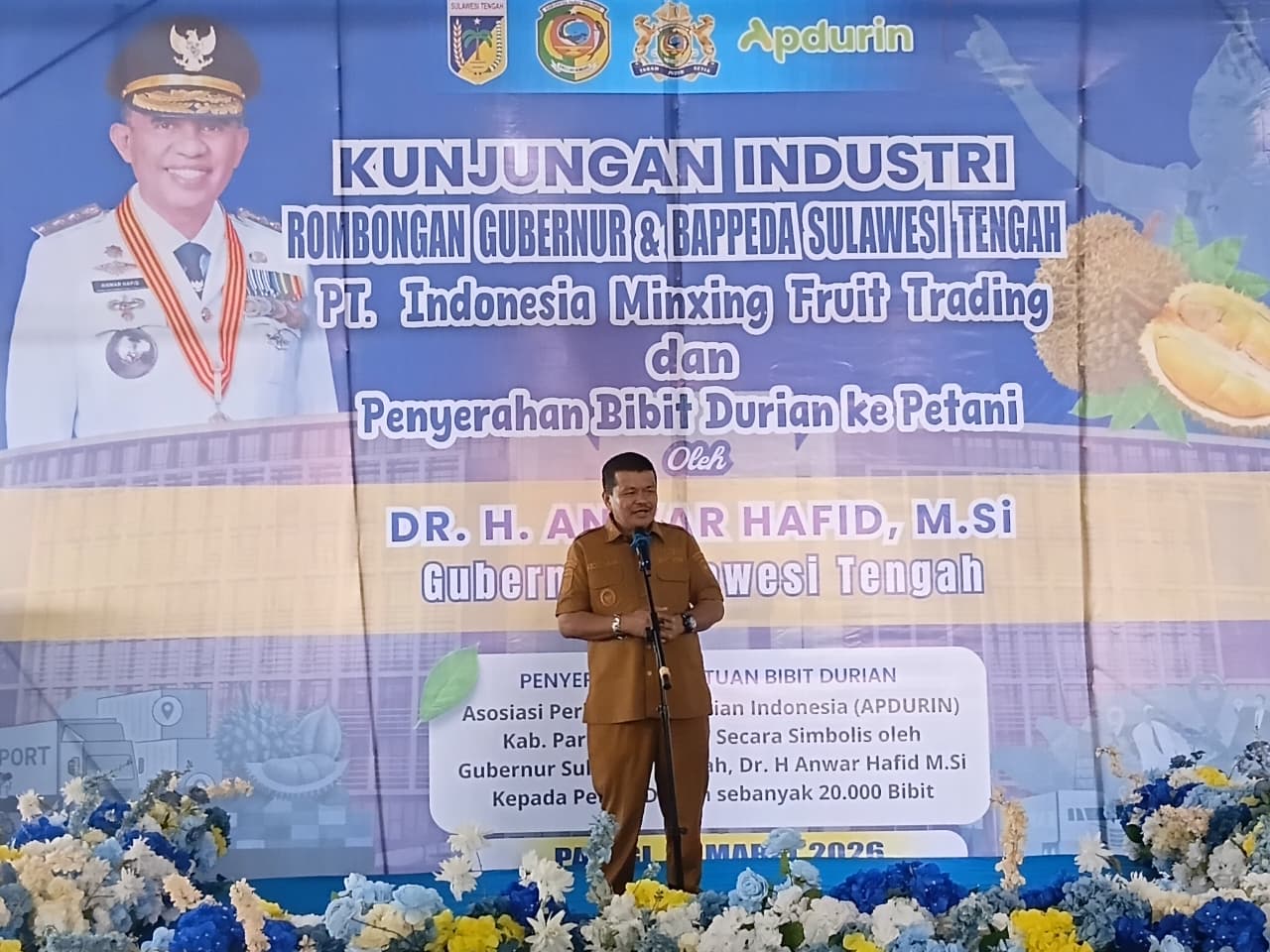 Hal tersebut disampaikannya dalam kegiatan kunjungan industri bersama rombongan Gubernur dan Bappeda Sulawesi Tengah di PT Indonesia Minxing Fruit Trading, yang dirangkaikan dengan penyerahan bibit durian kepada para petani.