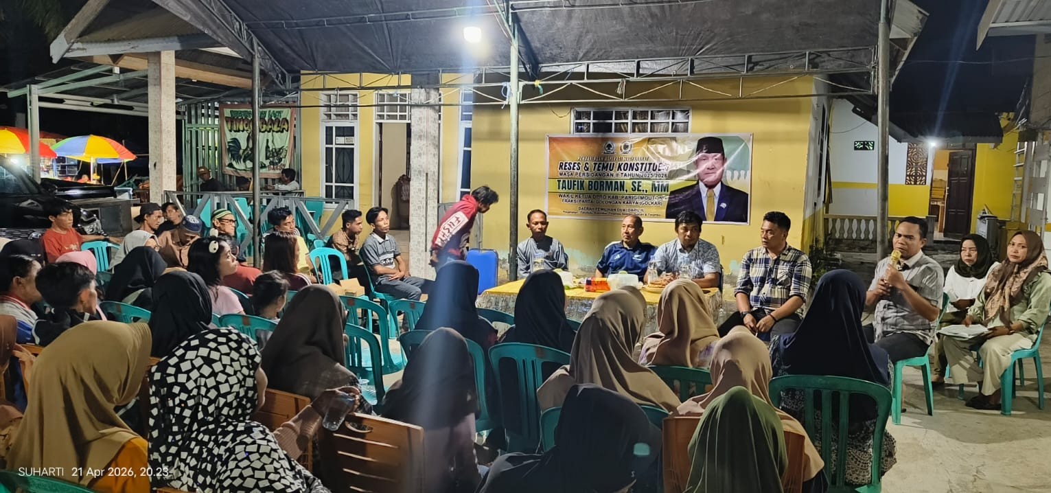 Parimo,Updatesulawesi.id – Wakil Ketua DPRD Kabupaten Parigi Moutong dari Fraksi Partai Golkar, Taufik Borman, S.E., menggelar kegiatan reses masa persidangan tahun 2026 di Dusun 3 Desa Tinombo, Kecamatan Tinombo, Selasa (21/04/2026). Kegiatan ini menjadi wadah bagi masyarakat untuk menyampaikan berbagai aspirasi dan kebutuhan pembangunan di wilayah tersebut.