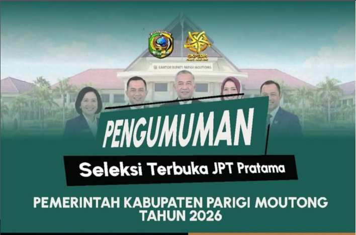 Parimo, Updatesulawesi.id – Pemerintah Kabupaten Parigi Moutong resmi membuka Seleksi Terbuka Jabatan Pimpinan Tinggi (JPT) Pratama Tahun 2026. Kesempatan ini ditujukan bagi Aparatur Sipil Negara (ASN) yang memenuhi syarat untuk mengisi posisi strategis di lingkungan pemerintahan daerah.